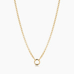 14k gold plated 3mm rolo chain necklace with center hinge opening for interchangeable charm styling. Measures 32" in length.