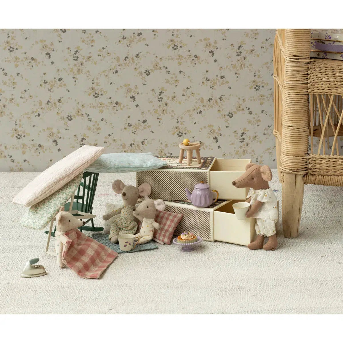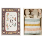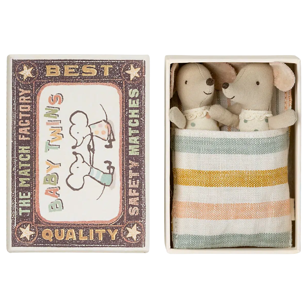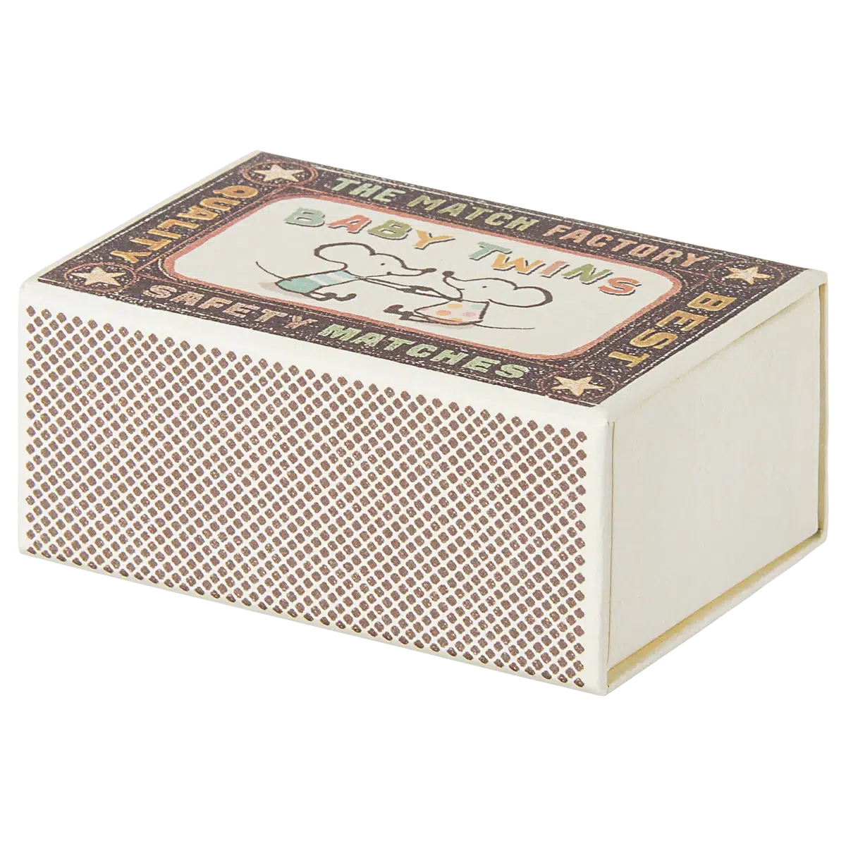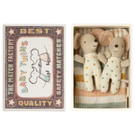 Meet our adorable baby twin mice, snugly tucked side by side in their cozy sleeping bag, nestled perfectly in their matchbox bed. These tiny twins, dressed in charming polka dot onesies, will keep their mum on her toes during the day and sleep soundly at night.