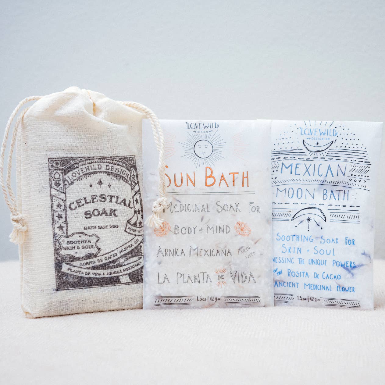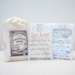 This Celestial Soak gift set offers a beautiful way to relax and connect with the natural rhythms of the sun and moon. The Sun Bath Salt combines Epsom salt with prickly pear, also known as planta de vida, and a sprinkle of wild-harvested Mexican arnica for a refreshing, revitalizing soak. The Mexican Moon Bath Salt features rosita de cacao, an ancient flower known for its nourishing and healing qualities, perfect for unwinding and restoring balance. Together, these bath salts create a soothing ritual that brings a touch of magic and nature into your self-care routine. Nestled in a hand stamped cotton bag.