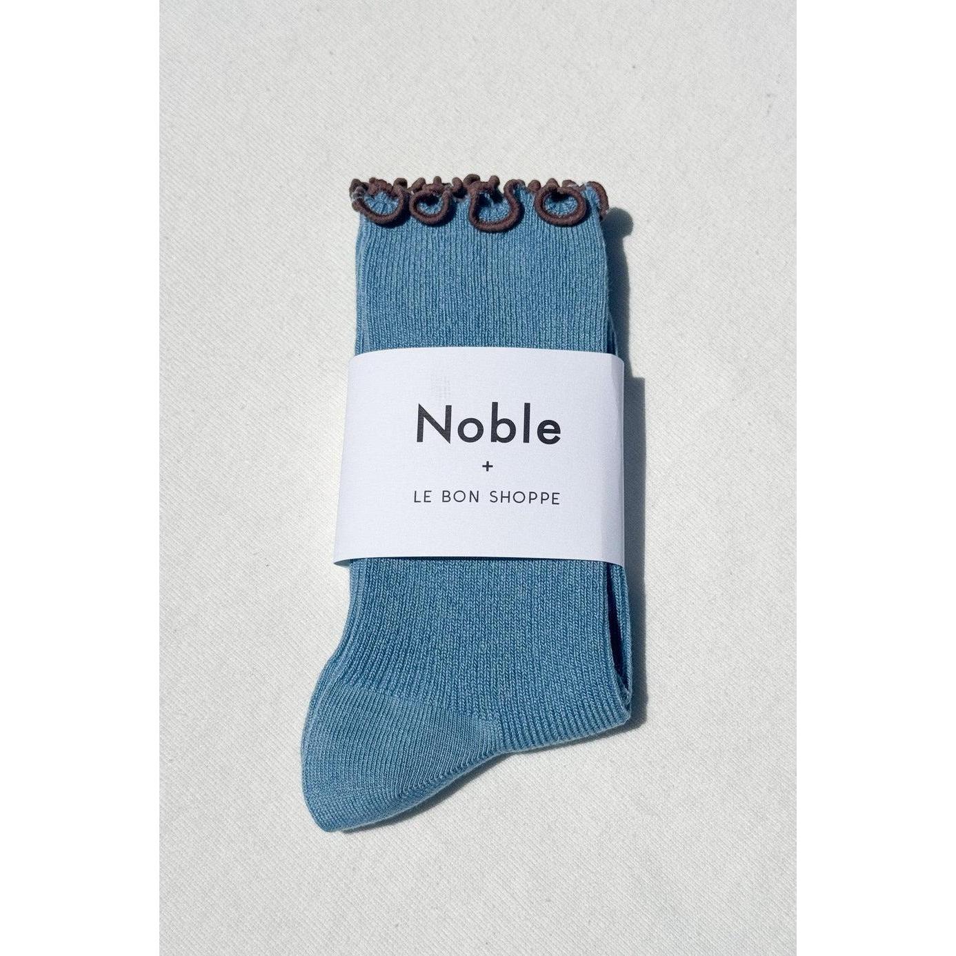 Noble x Le Bon Shoppe — A sock born from their shared love of slow fashion, good design, and color combos that go with literally everything. The Ruffled Modal Socks feature a baby rib texture with a playful lettuce-edge ruffle at the top. Their versatile crew length makes them perfect worn long or scrunched down.