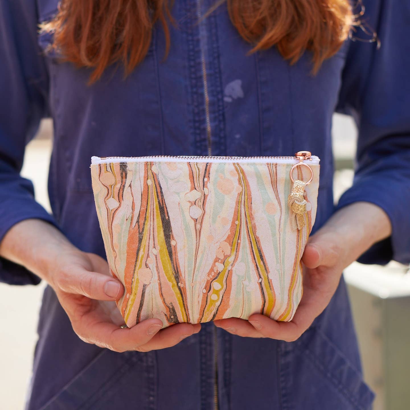 Hand marbled panels of mill end cotton canvas are done in studio and then sewn into these marvelous canvas pouches perfect for all sorts of objects and accessories, or to use as a cute clutch.