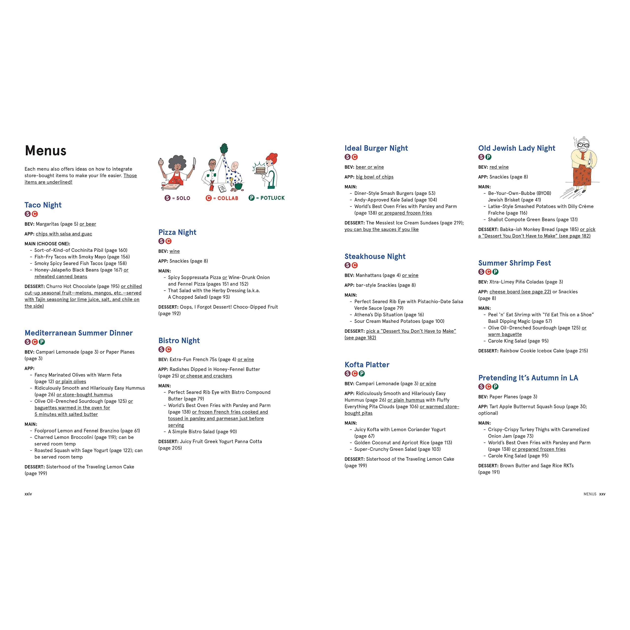 Forget fussy recipes with ingredients lists that run a mile long. With sections on appetizers, main dishes, drinks, sides, and desserts, Feldman provides recipes for every mood and cooking comfort level (including pizza parties, taco nights, and permission to order takeout). Whimsical illustrations help demystify the cheese plate, offer store-bought dessert options, and guide you to your ideal dinner menu; tips within each recipe ensure great results and help you plan ahead and avoid last-minute scrambling.